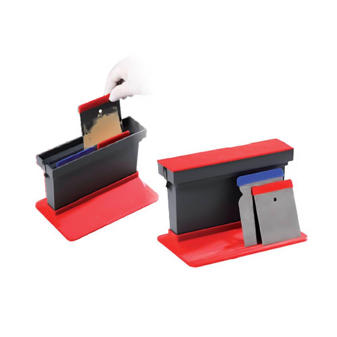 Устройство для очистки шпателей с простым принципом действия. Достаточно налить растворитель в резервуар, ввести грязный металлический шпатель в одну из щелей чистящей плитки, а устройство очистит шпатель. Чистящие ножи специальной формы подобраны таким образом, чтобы как можно эффективнее собирать все загрязнения. Шесть выемок в основании позволяют отложить очищенный шпатель, пока растворитель не стечет или не испарится, благодаря чему шпатель готов к использованию в любой момент.